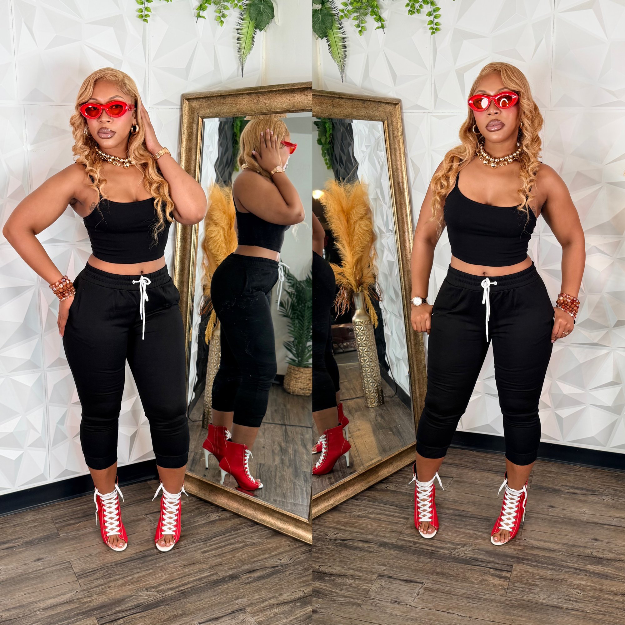 model wearing a medium crop top and jogger