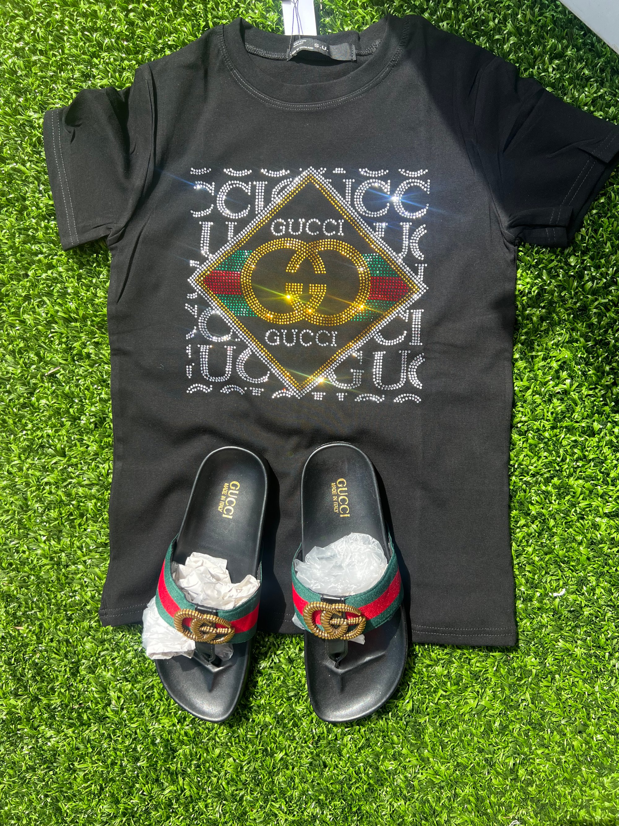 95% polyester 5% spandex Shirt is one size fit sizes small-large Slides not included/sold separately Remember you are purchasing the T-Shirt ONLY
