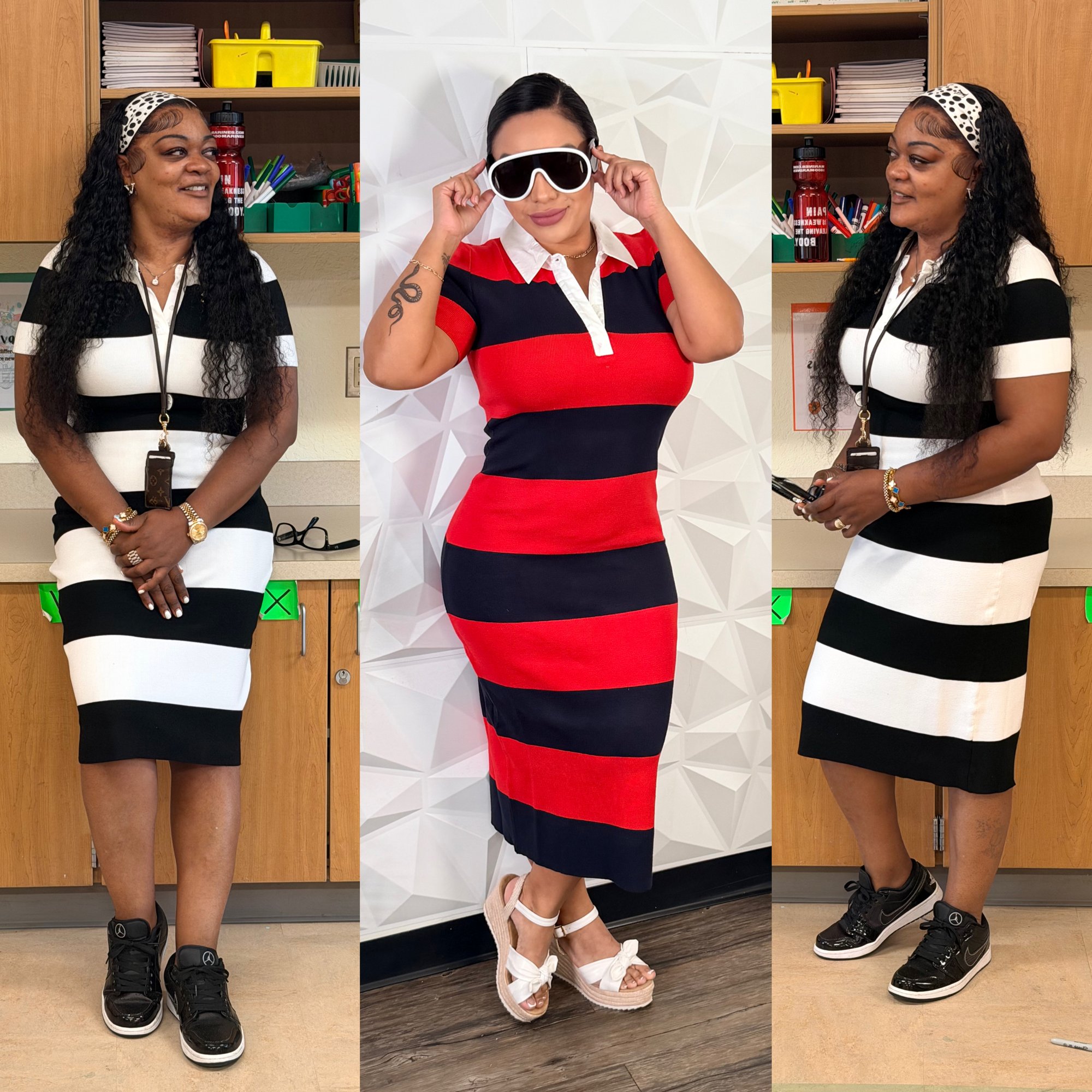 Model wearing red dress medium and blk dress large Dress has great stretch Small 2-8 Medium 9-11 Large 12-14 95 cotton 5 spandex